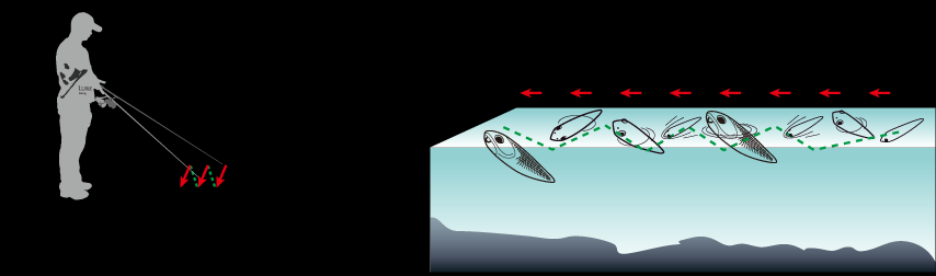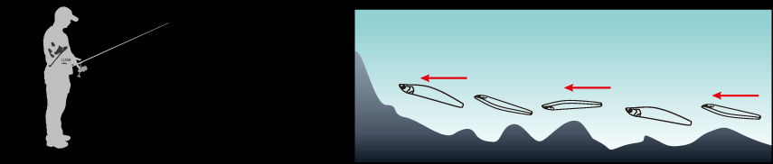 最常用的操控方式,抛出让沉水铅笔到达目标水层后,侧身横抽,挥动竿尖幅度每次约50cm,复位,收紧余线,隔一秒再抽一次,如此反复。与“M”型操控不同的是,路亚表现出水平方向上的左窜右逃的交替,似小鱼毫无戒心的游玩,攻取水库、湖泊的翘嘴鲌效果突出,对于海水类目标鱼就如岸投小铁板,效果亦佳。