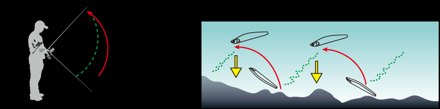 路亚抛出后稍等下沉,视需要下沉到一定深度后,人面向水面,收紧余线,向上扬竿,力度视情况需要,可重可轻,然后放下竿尖松线,再让路亚下沉;路亚搜索深度范围很大,适合大水面搜索鱼所在泳层,在鱼索饵意愿不积极时,这种轻缓的手法非常有效。