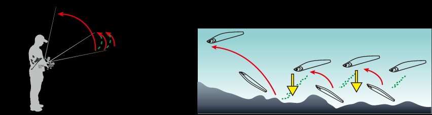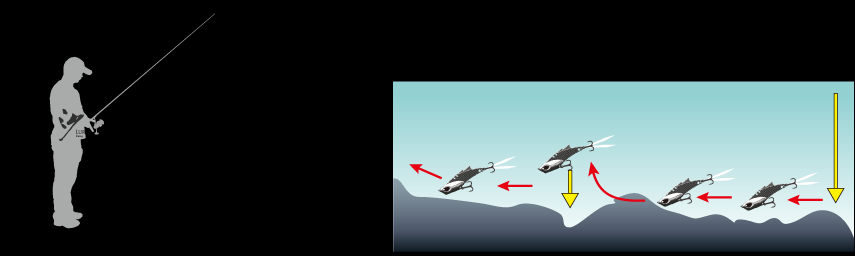 上图操作手法的变式,在路亚下沉到目标水层后,先连续两下轻抽钓竿,随后向上高高扬竿,在这连续三抽过程中,卷线器是不收线的,随后放低竿子再收紧余线。这种操作手法,逼真模拟小鱼逃窜,运用到搜索底层时,效果非凡,鳜鱼类的也特别喜欢攻击。使用这个操作时,手法宜轻缓,这样在目标鱼警戒心高或者活力较低的冬天时,会收到出其不意的效果。