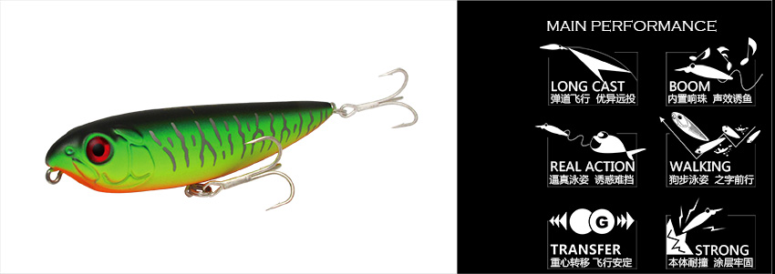 沉水铅笔最致命的杀伤力就是能够完美实现作钓者随心所欲的操控,真正体现你的作钓思路。 铅笔、米诺和颤游的强强联合,表层到底部,不论何种方式操控,中鱼!匀速收线,缓慢摇摆,如毫无戒心游着的小鱼,猎食鱼岂肯错过;小抽猛拉,如鱼逃窜,高频小抽特别是“狗步”操控时,如同垂死的小鱼最后无力的挣扎,而猛拉再稍加停顿时,又如四处游逃还被吓呆的小鱼,诱惑无可抵挡;下沉自颤,头部下倾,加上腹尾两枚银色三本钩鱼鳍般的同频颤动,目标鱼最易从腹下发动雷霆一击,多数腹钩中鱼,而“自沉”配合“匀收”或“小抽”,则可在水层中进行“W”搜索,全泳层出击!