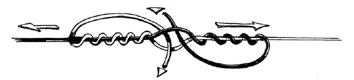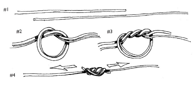 SURGEON’S KNOT 这个线结与上一个线结的用途一样,绑法也比较简单,打结也比较快速,具体绑法如下图。不过要注意绑这个结,有一端的线要比另一端的线要短一些才可以,这样才能方便的在小结里面缠绕。