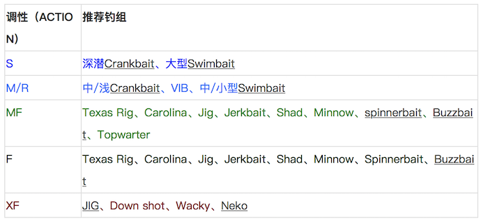 - 不同调性Bass竿特性不同,选择搭配合适的推荐钓组如下: