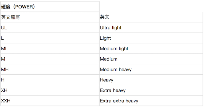 - 路亚竿硬度(POWER)的表示方式:
