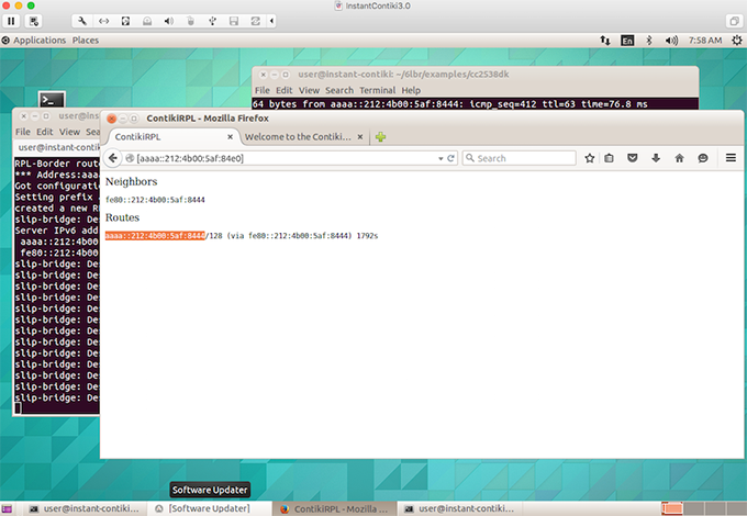 user@instant-contiki:~/6lbr/examples/cc2538dk$ ping6 aaaa::212:4b00:5af:84e0 PING aaaa::212:4b00:5af:84e0(aaaa::212:4b00:5af:84e0) 56 data bytes 64 bytes from aaaa::212:4b00:5af:84e0: icmp_seq=1 ttl=64 time=21.1 ms 64 bytes from aaaa::212:4b00:5af:84e0: icmp_seq=2 ttl=64 time=21.5 ms 64 bytes from aaaa::212:4b00:5af:84e0: icmp_seq=3 ttl=64 time=21.1 ms
