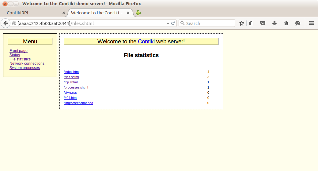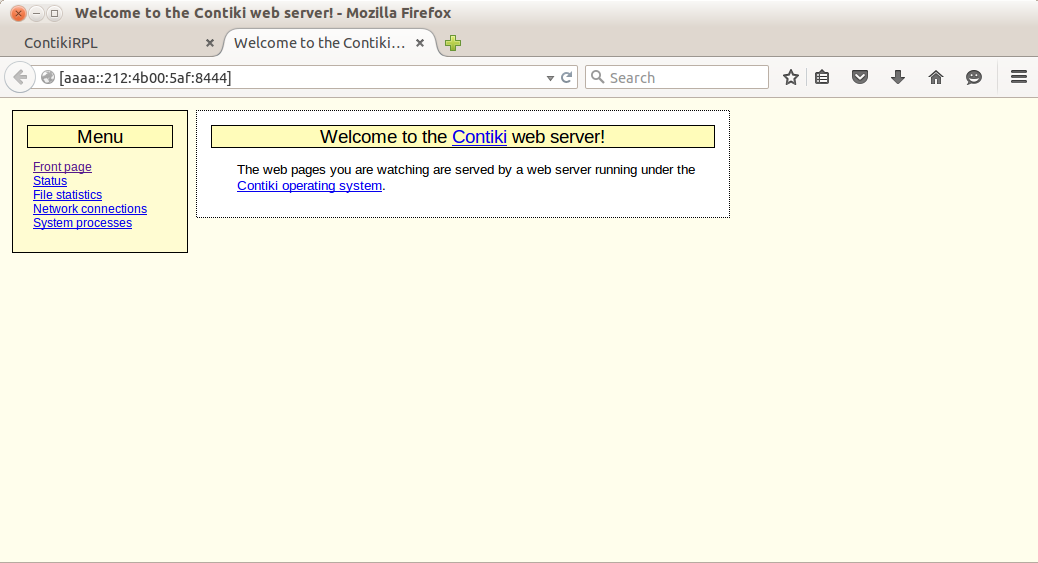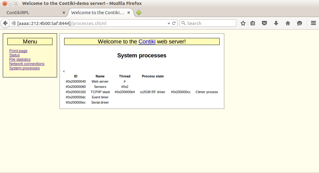 user@instant-contiki:~/contiki/tools$ sudo ./tunslip6 aaaa::1/64 -s /dev/ttyUSB0 [sudo] password for user: ********SLIP started on ``/dev/ttyUSB0'' opened tun device ``/dev/tun0'' ifconfig tun0 inet `hostname` mtu 1500 up ifconfig tun0 add aaaa::1/64 ifconfig tun0 add fe80::0:0:0:1/64 ifconfig tun0 tun0 Link encap:UNSPEC HWaddr 00-00-00-00-00-00-00-00-00-00-00-00-00-00-00-00 inet addr:127.0.1.1 P-t-P:127.0.1.1 Mask:255.255.255.255 inet6 addr: fe80::1/64 Scope:Link inet6 addr: aaaa::1/64 Scope:Global UP POINTOPOINT RUNNING NOARP MULTICAST MTU:1500 Metric:1 RX packets:0 errors:0 dropped:0 overruns:0 frame:0 TX packets:0 errors:0 dropped:0 overruns:0 carrier:0 collisions:0 txqueuelen:500 RX bytes:0 (0.0 B) TX bytes:0 (0.0 B) *** Address:aaaa::1 => aaaa:0000:0000:0000 Got configuration message of type P Setting prefix aaaa:: created a new RPL dag Server IPv6 addresses: aaaa::212:4b00:5af:84e0 fe80::212:4b00:5af:84e0
