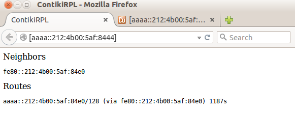 PING aaaa::212:4b00:5af:84e0(aaaa::212:4b00:5af:84e0) 56 data bytes 64 bytes from aaaa::212:4b00:5af:84e0: icmp_seq=1 ttl=63 time=1013 ms 64 bytes from aaaa::212:4b00:5af:84e0: icmp_seq=2 ttl=63 time=126 ms 64 bytes from aaaa::212:4b00:5af:84e0: icmp_seq=3 ttl=63 time=126 ms 64 bytes from aaaa::212:4b00:5af:84e0: icmp_seq=4 ttl=63 time=126 ms 64 bytes from aaaa::212:4b00:5af:84e0: icmp_seq=5 ttl=63 time=125 ms 64 bytes from aaaa::212:4b00:5af:84e0: icmp_seq=6 ttl=63 time=120 ms