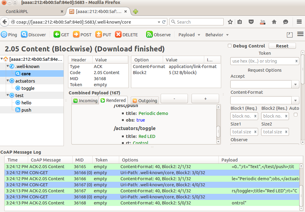 *** Address:aaaa::1 => aaaa:0000:0000:0000 Got configuration message of type P Setting prefix aaaa:: created a new RPL dag Server IPv6 addresses: aaaa::212:4b00:5af:8444 fe80::212:4b00:5af:8444