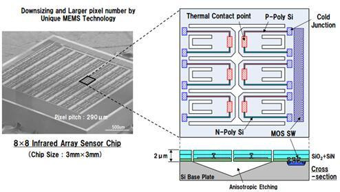 现代半导体技术实现了在几平方毫米内,制造包含数百个热电偶的红外热电堆传感器。这种红外传感器因其微小的尺寸,而具有极高的灵敏度和极快的响应时间,而且由于应用了半导体规模生产和光刻技术,使其成本也较低。