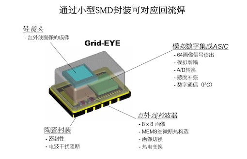 松下Grid-EYE的8 x 8热电堆阵列红外传感器,开启了其红外阵列传感器业务。Grid-EYE是一款64像素红外摄像头,采用一体化的紧凑SMD封装。基于松下的MEMS技术,Grid-EYE包含一颗MEMS传感器芯片、一颗数字ASIC(I2C接口)以及一款硅基镜头。