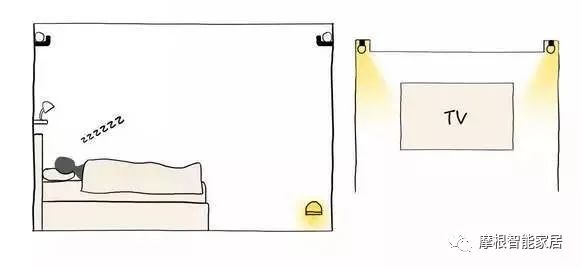 如果比较怕黑的,可以学酒店,在床尾设置光线微弱的墙角灯,增加安全感。晚上睡觉时只需要开一盏小小的灯就够了。