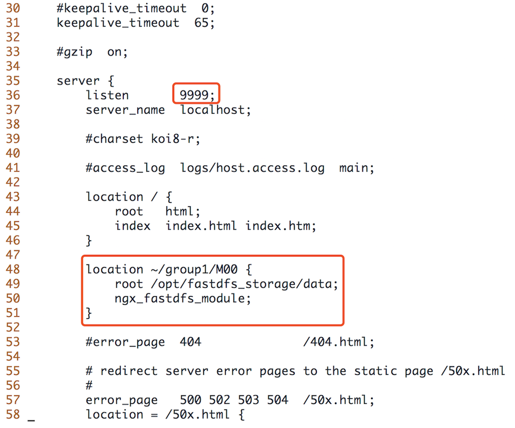 接下来依然是修改nginx2的配置文件,进入conf目录并打开nginx.conf文件加入以下配置,storage的nginx无需修改listen端口,即默认的80端口,并将upstream指向tracker的nginx地址: