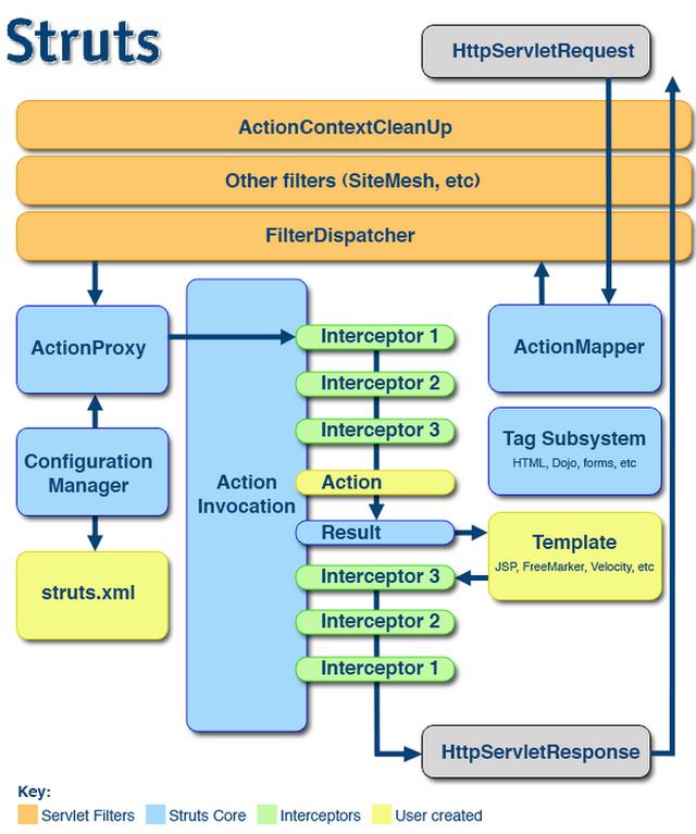 • 2、这个请求经过一系列的过滤器(Filter)(这些过滤器中有一个叫做ActionContextCleanUp的可选过滤器,这个过滤器对于Struts2和其他框架的集成很有帮助;