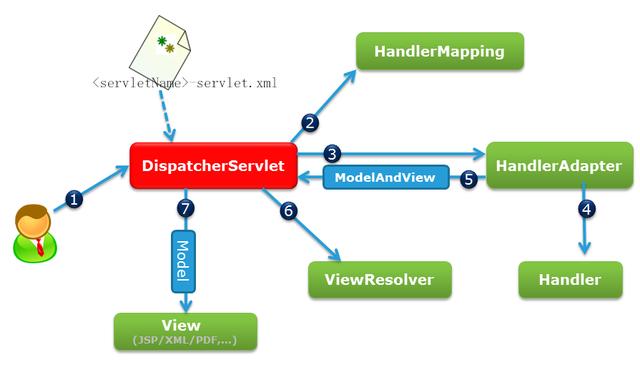 • 6、Handler返回的ModelAndView()只是一个逻辑视图并不是一个正式的视图,DispatcherSevlet通过ViewResolver将逻辑视图转化为真正的视图View;