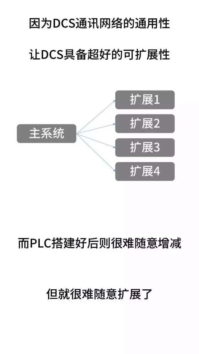 DCS从传统的仪表盘监控系统发展而来。因此,DCS从先天性来说较侧重于仪表的控制,比如YOKOGAWACS3000,DCS系统甚至没有PID数量的限制(PID,比例微分积分算法,是调节阀、变频器闭环控制的标准算法,通常PID的数量决定了可以使用的调节阀数量)。