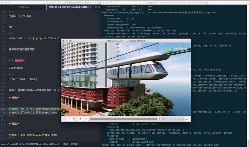1 | ffmpeg -re -i /Volumes/WORK/Moorgen/演示资料/演示视频/moorgen.mp4 -vcodec libx264 -acodec aac -f flv rtmp://127.0.0.1:1935/myapp/room |