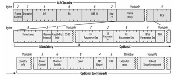 BeaconFrame:信标帧,是相当重要的维护机制,主要来宣告某个AP网络的存在。定期发送的信标,可让移动WiFi设备得知该网络的存在,从而调整加入该网络所必要的参数。在基础网络里,AP必须负责发送Beacon帧,Beacon帧所及范围即为基本服务区域。在基础型网络里,所有沟通都必须通过接入点,因此WiFi设备不能距离太远,否则无法接收到信标。下图是帧格式: